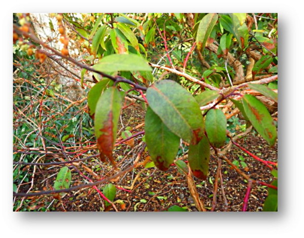 Unequivocal identification of ramorum blight from visual symptoms alone is impossible. Symptoms include dark, water-soaked dead spots on the leaves. The spots often form a wedge shape, starting at the leaf tip or the leaf base and can be present on the upper and lower leaf surfaces. The problem is that many other species of the Phytophthora fungus produce the same symptoms. To confirm that P. ramorum is causing the symptoms, leaf samples must be sent to a properly-equipped plant diagnostic laboratory.